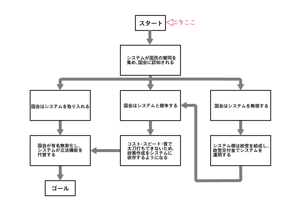 立法機能をこのシステムで置き換えるにはどうしたらよいか。下図はその戦略を示しています。国会が左・中のルートを採用する場合、立法機能の正常化は比較的スムーズに行われます。国会が右のルートを採用する場合、システム側も政党を結成し、党議員はシステムを運用するための政党交付金の獲得とエヴァンジェリスト活動を行います