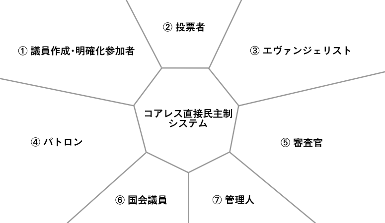 コアレス直接民主制システムは機能不全に陥っている立法府(国会)を置き換えるための新しい仕組みです。どのようなものか、 以下のリンクから学びましょう。メニューの「仕組みを学ぶ」から個別記事に直接移動することもできます