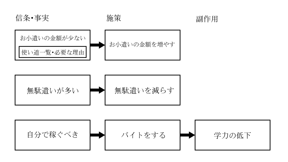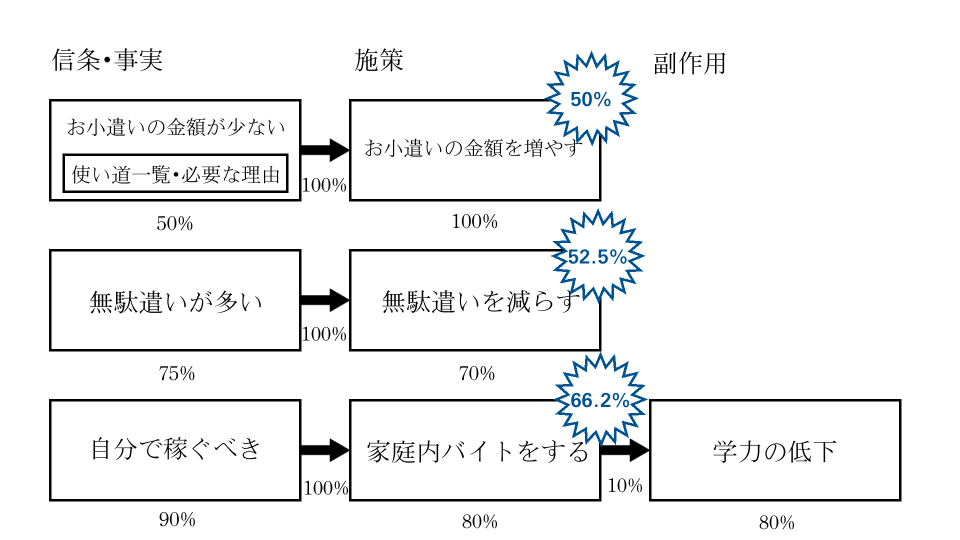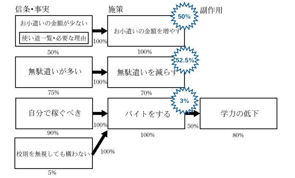 「副作用」は施策実施に伴って発生する良くない効果のことです。副作用の下のパーセント表記はこの効果が深刻かどうか。施策から副作用への矢印の下にあるパーセント表記は、施策を実施した場合にこの副作用が発生すると思うか。学力の低下は80%だから、かなりの人が深刻と考えているみたいです。一方発生するかどうかは50%。たぶんみひろの普段の成績や複数のことをそつなくこなす能力についての情報が不足していて、決めかねているのでしょう