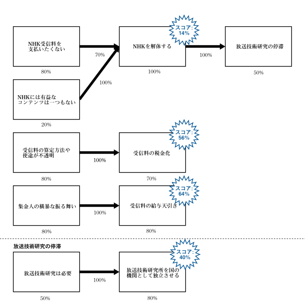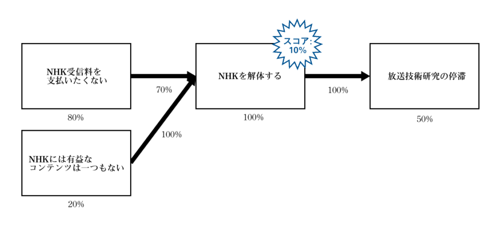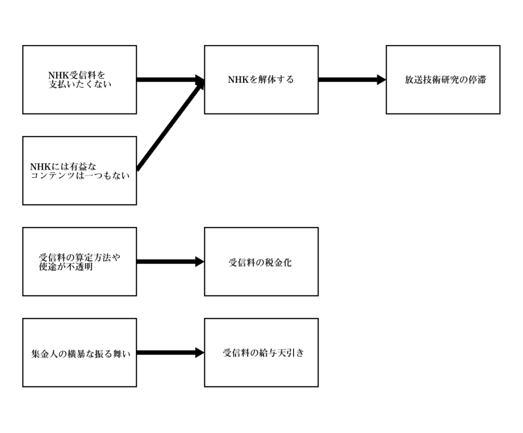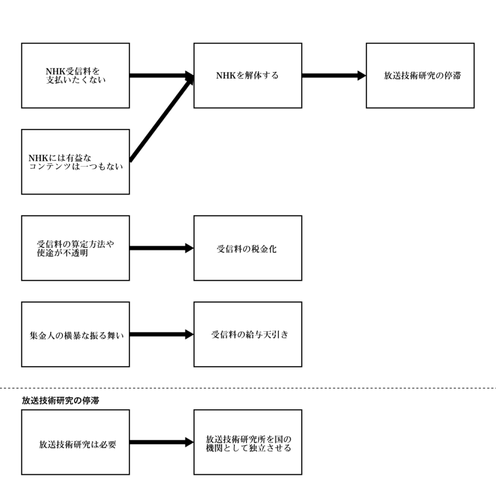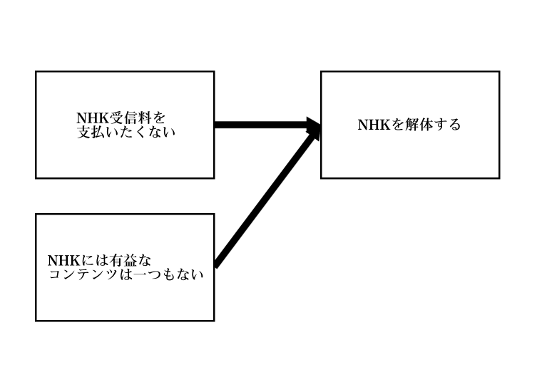 つまりね、賛成者が本当に解決したいのはその二つの問題であって、「受信料を払いたくない」、もっとわかりやすく言えば「受信料を払わない」は実際のところ信条・事実ではなく、そのための方法、つまり施策なのよ