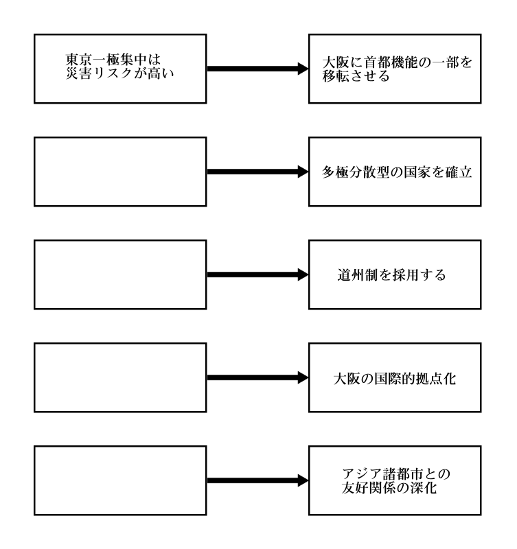 東京一極集中は、地震等の大災害時に国家機能の全てがストップしてしまうので、復旧復興が困難であるというリスクが表面化しています。大阪に首都機能の一部を持たせ、先ずは二極化することによりそのリスクを解消し、その後に多極分散型の国家を確立します。それを支える地方自治制度としての道州制を目指します
