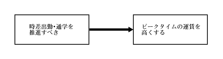 これまでの議論をまとめると、価格設定における各交通機関の裁量権はとにかく保証しないといけない。一方ピークタイムの開始・終了時間については都で決めても良さそう。みひろ、これをアクション(信条・事実と施策のセット)に置き換えてみて